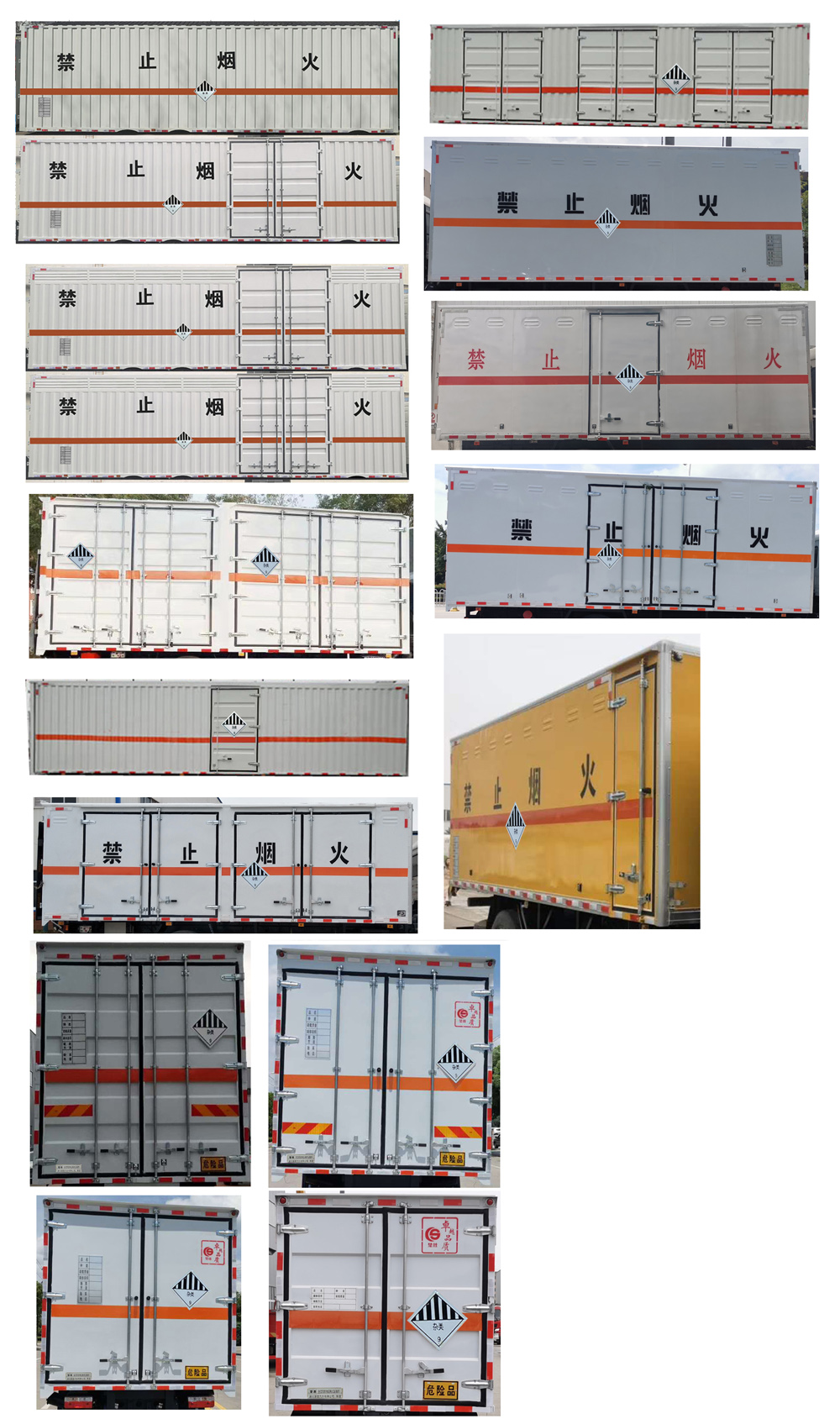 其它 | 1、該車適用于危險(xiǎn)品運(yùn)輸,類項(xiàng)號(hào):9。廂體頂部封閉,不可開啟。2、側(cè)、后防護(hù)材料均為Q235,側(cè)防護(hù)螺栓連接;后防護(hù)焊接,截面尺寸120×50mm,下邊緣離地高450mm。3、僅采用軸距(mm):4700,5150。僅選用排氣管前置、限速裝置(限速80km/h)、前輪盤式制動(dòng)及子午線輪胎的底盤;安裝帶有衛(wèi)星定位功能的行駛記錄儀;ABS系統(tǒng)型號(hào)/生產(chǎn)企業(yè)對(duì)應(yīng)關(guān)系:ABS-E/威伯科汽車控制系統(tǒng)(中國(guó))有限公司;ABS/ASR-24V-4S/4M/東科克諾爾商用車制動(dòng)系統(tǒng)(十堰)有限公司;CM4XL-4S/4M/廣州瑞立科密汽車電子股份有限公司;3550D-1010/東科克諾爾商用車制動(dòng)系統(tǒng)(十堰)有限公司.采用的發(fā)動(dòng)機(jī)與油耗值(L/100Km)對(duì)應(yīng)關(guān)系為:F4.5NS6B220/24.4,B6.2NS6B210/26。該車轉(zhuǎn)向輪安裝輪胎爆胎應(yīng)急防護(hù)裝置,后軸采用空氣懸架。該車型可選裝ETC車載裝置.隨底盤選裝駕駛室。廂體側(cè)面選裝開門型式及位置,選裝不帶側(cè)開門,選裝瓦楞板或平板結(jié)構(gòu);廂體側(cè)面板選裝開百葉窗。選裝后尾板時(shí),后防護(hù)材料為Q235,焊接,截面尺寸120×50mm,下邊緣離地高450mm。尾板收起狀態(tài)水平長(zhǎng)度為290mm,尾板質(zhì)量為550kg。選裝制冷機(jī)組,選裝燃油箱,電瓶,尿素罐,后處理,儲(chǔ)氣筒左右安裝位置。 | ||