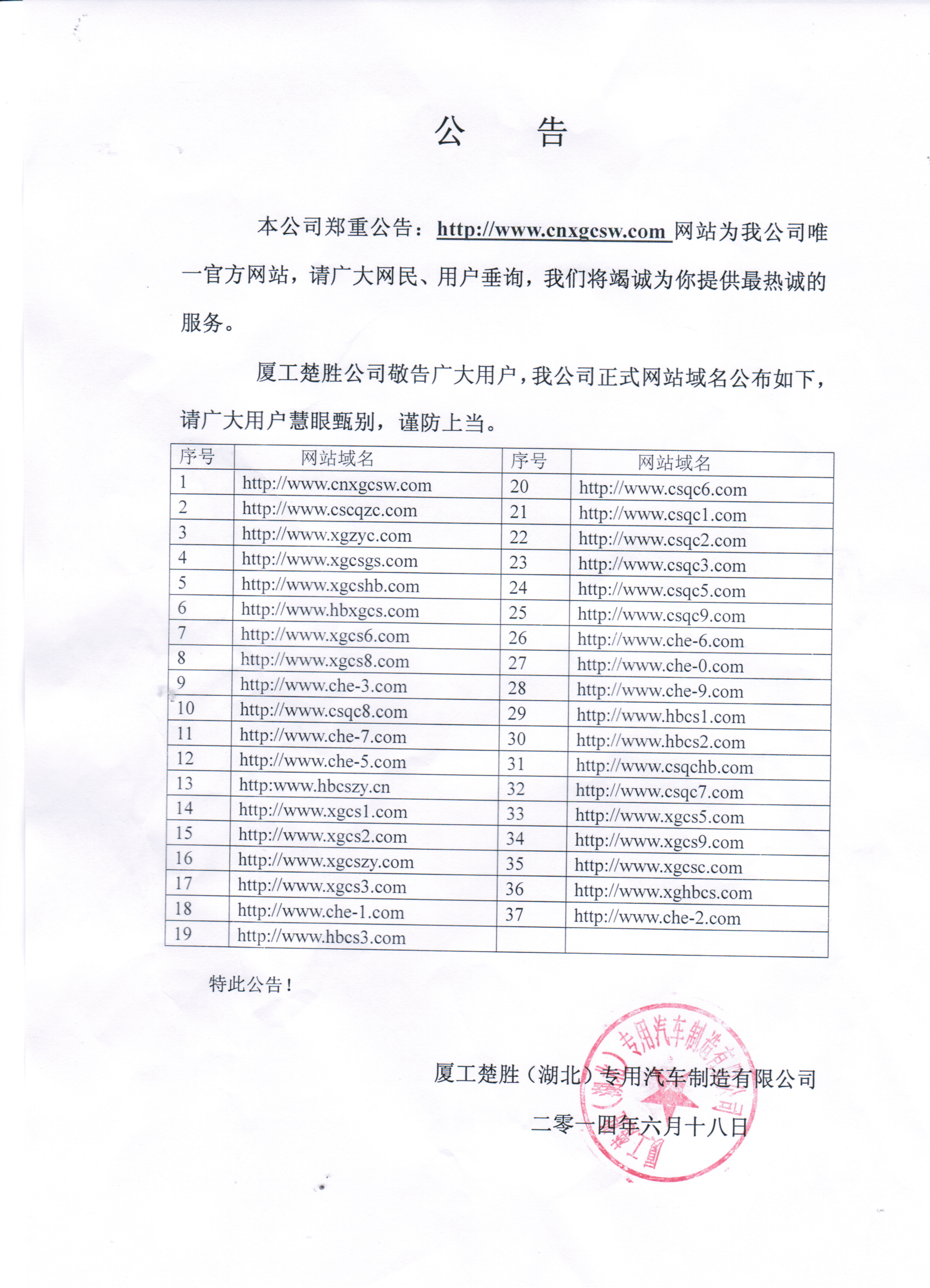 廈工楚勝公司敬告廣大用戶,我公司正式網(wǎng)站域名公布如下,請(qǐng)廣大用戶慧眼甄別,謹(jǐn)防上當(dāng)。